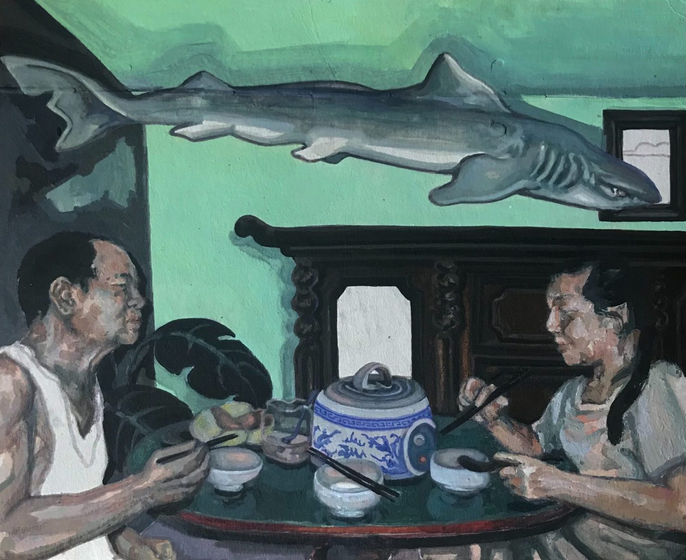 Trong không khí thân mật của một bữa cơm gia đình, bạn sẽ thấy tui vẽ lại chân dung ông bà ngoại khi về Hà Nội thăm. Cố gắng gặp họ thường xuyên, hiểu hơn về cuộc đời cũ của họ và cách họ nhìn thế giới. Cảm giác “nhà” có thể đến từ món ăn và thời gian ngồi lại bên nhau. Bà ngoại thì cứ muốn ép cho tui ăn thêm, vừa ép vừa chọc mập (hahaha). Món nào cũng mềm để ông ngoại dễ ăn vì răng ông yếu rồi. Chuyện trên trời dưới đất được kể quanh bàn ăn, tui thì thấy thoải mái là chính mình (nhưng không quá lố). Mấy khoảng trống giữa các cảnh, với con cá mập bay, là cách tui chạm vào cảm giác cô đơn và lạc lõng - dù có cơ hội nối lại với cội nguồn, vẫn còn cái nhu cầu muốn được thuộc về một cách sâu hơn.